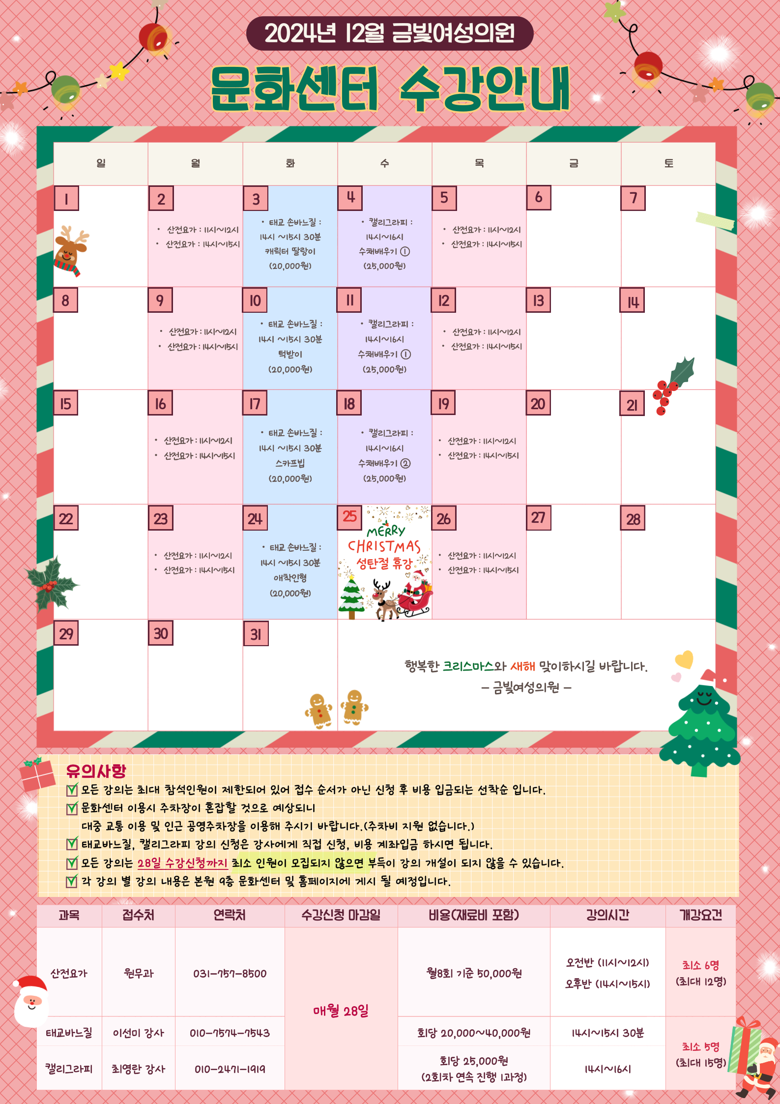 산전 요가 및 태교 손바느질, 캘리그래피 등 12월 문화센터 강좌가 개강됨을 안내드립니다.